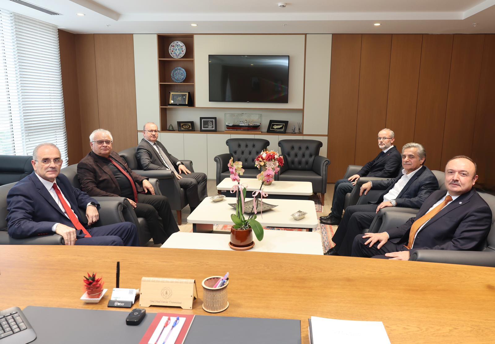 Rektörlük makamında gerçekleşen ziyarete; Rektör Yardımcılarımız Prof. Dr. Alpaslan Serel ve Prof. Dr. Mehmet Emin Erçakar, Genel Sekreterimiz Faruk Küçük ile emekli olan eski Genel Sekreterimiz Cihangir Boz da eşlik etti.